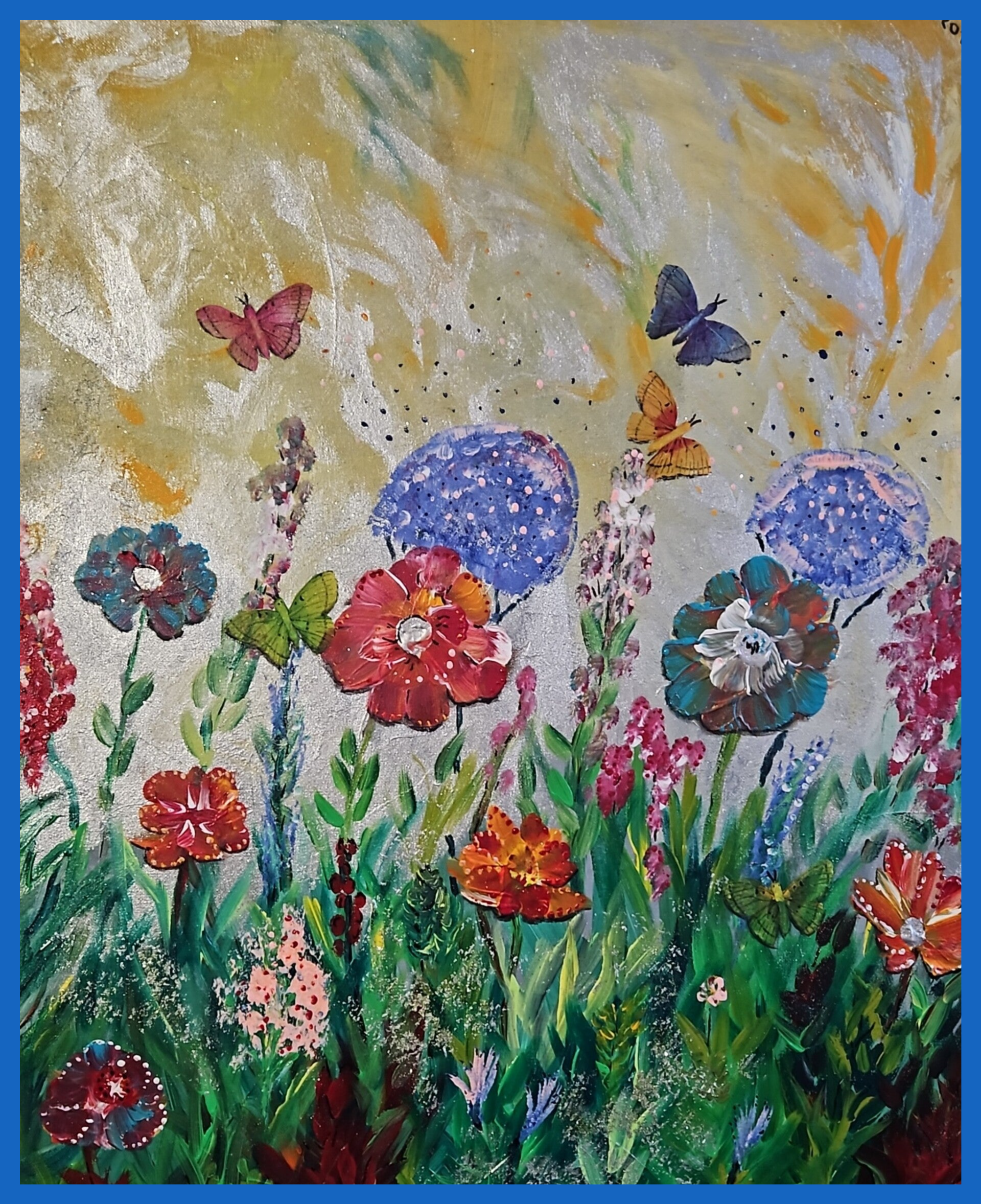 Schmetterlinge in Rot, Blau, Gold und Violett schweben über der Blumenwelt wie kleine Botschafter des Sommers.