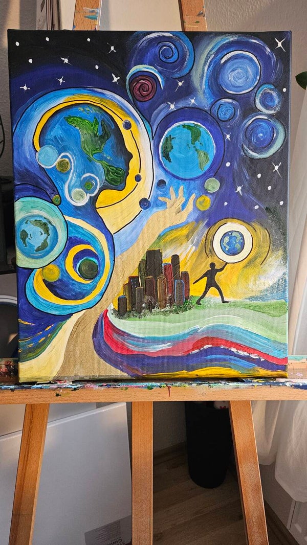 Die Farbwahl – mit intensiven Blautönen, Gelb, Grün und Violett – wirkt energetisch, fast traumartig. Die fließenden Bewegungen erinnern an van Goghs „Sternennacht“, werden hier jedoch zu einem kosmischen Tanz um die Erde als Zentrum unseres Daseins.